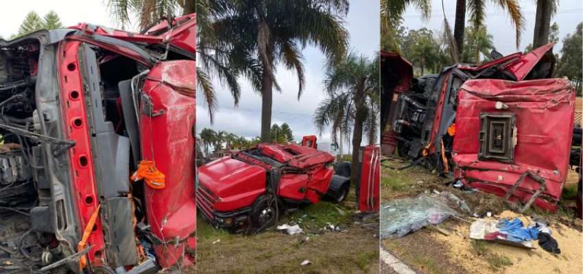 O motorista acabou perdendo o controle do veículo, que estava carregado com arroz, em uma curva. A carreta saiu da pista e capotou. Conforme informações apuradas pela equipe do BJ News, havia bastante neblina na via no momento do acidente.
