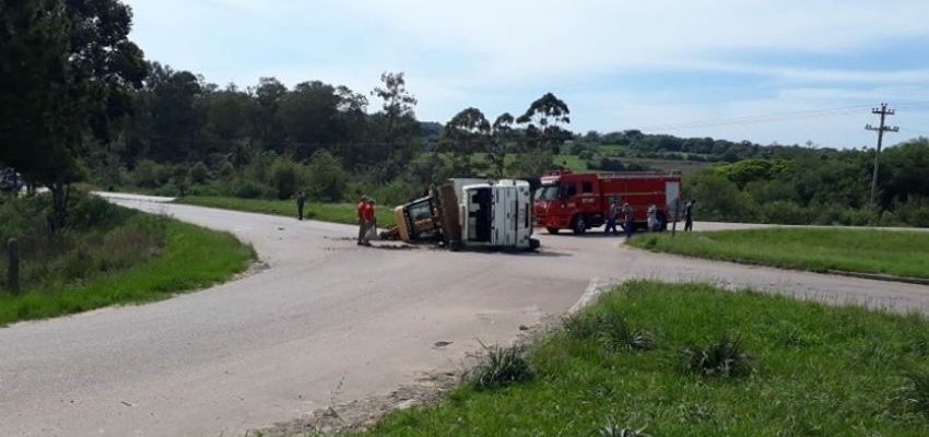 Na manhã desta sexta-feira (11) um caminhão tombou no Trevo da Balança na RSC-471, em Encruzilhada do Sul. O caminhão transportava uma retro escavadeira.