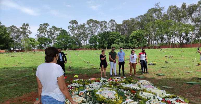 Sobre o túmulo de Marília Mendonça, muitas coroas de flores foram colocadas por artistas. Uma delas tinha formato de violão, instrumento que a cantora tocava.