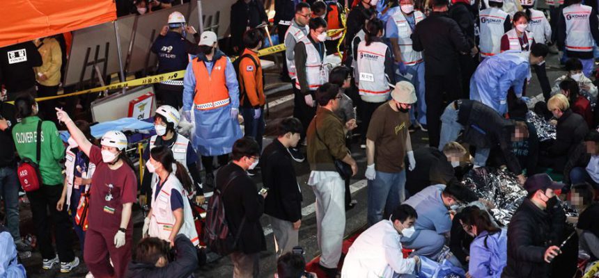 A polícia fechou a área no bairro de Itaewon, em Seul, e vídeos de mídia social mostraram pessoas deitadas nas ruas. O presidente sul-coreano Yoon Suk Yeol enviou uma equipe de assistência médica para o incidente de Halloween, de acordo com o gabinete presidencial.