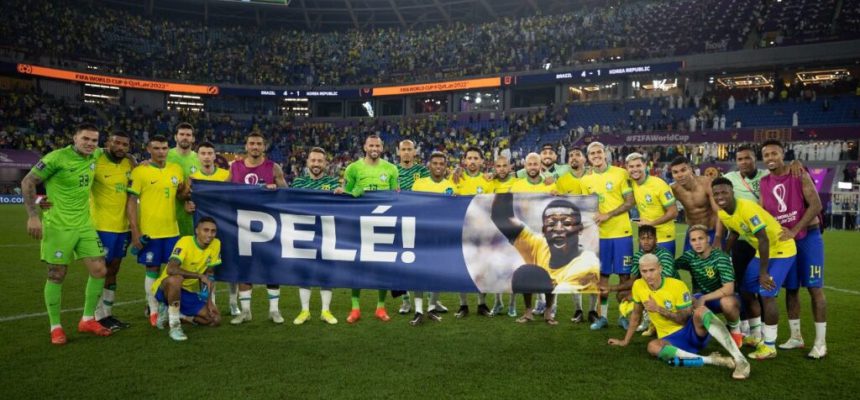 A Seleção fez bonita homenagem a Pelé após goleada contra a Coreia do Sul, por 4 a 1, nesta segunda-feira, na Copa do Mundo do Catar. Os jogadores entraram em campo com uma faixa com o nome do maior jogador da história do futebol e uma foto do Rei.