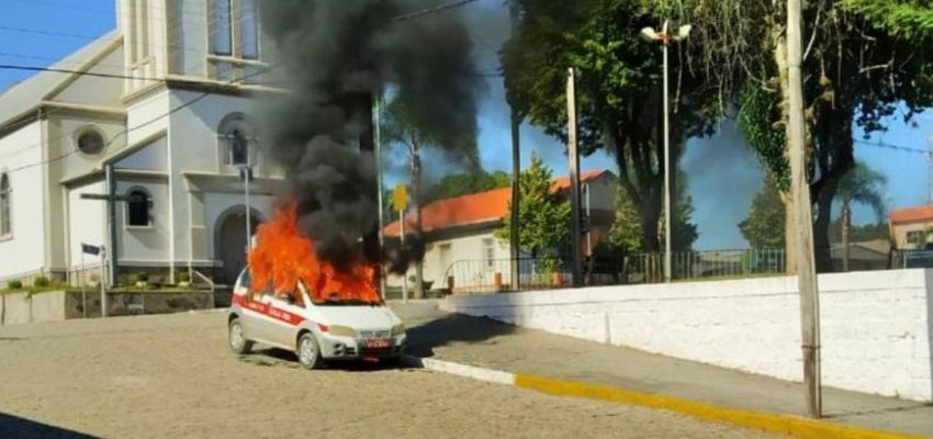 Perto do meio-dia desta sexta-feira (15), um táxi foi consumido pelo fogo na esquina da Avenida Borges de Medeiros com a Rua Treze de Maio, no centro de Dom Feliciano.