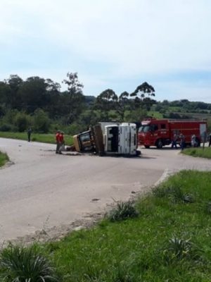 Caminhão que transportava retro escavadeira tomba em Encruzilhada do