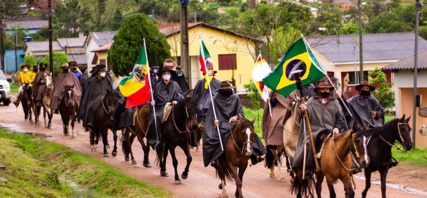 ? A cavalgada teve início no sábado (11), com a saída do Piquete da localidade de Monte Castelo, interior de Pantano Grande, onde se deslocaram em direção à Amaral Ferrador, pernoitando em propriedades e residências nos município de abrangência.