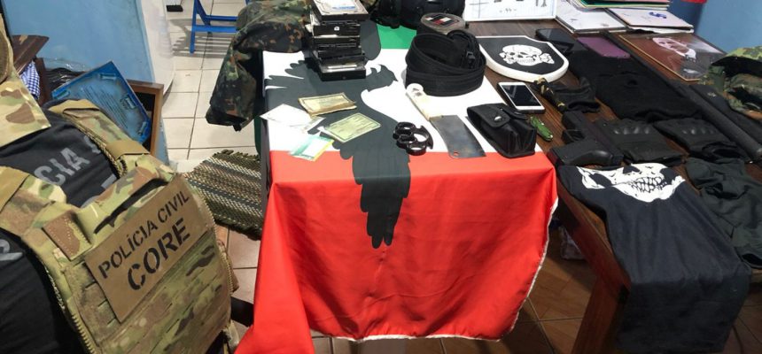 Durante o cumprimento de mandado de busca e apreensão na casa onde ele mora com os pais, na noite de terça-feira (11), os policiais recolheram um simulacro de arma de fogo, facas, fardas camufladas, fotos e bandeiras nazistas e fascistas.