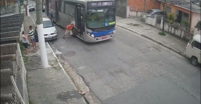 Já com os pés no chão, o idoso ainda tenta se segurar nas portas do coletivo, momento em que o motorista acelera e arrasta a vítima.