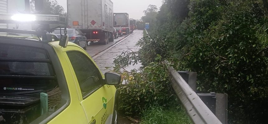 A pista da BR-116 no km 424, próximo ao Parque Bento Gonçalves, em Cristal, está totalmente bloqueada na tarde desta segunda-feira (23), devido à queda de uma árvore e fios de energia sobre a via.