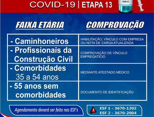 Já está liberado o agendamento para as novas faixas etárias da vacinação contra a covid-19, e os agendamentos devem ser feitos nas ESF’s de sua referência, conforme já vinha sendo feito.
