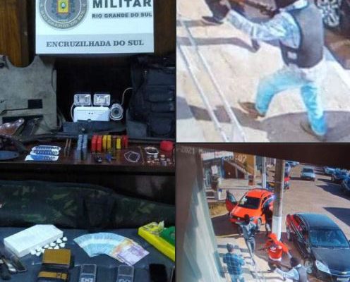 munições, droga, coletes balísticos e dinheiro, uma arma de fogo roubada no assalto da agência bancária na cidade de Amaral Ferrador.