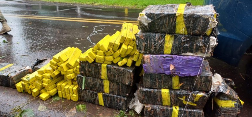 A droga estava em um veículo que capotou quando o motorista tentou acessar o município. Depois do acidente, diversos tabletes de maconha se espalharam pela rodovia.