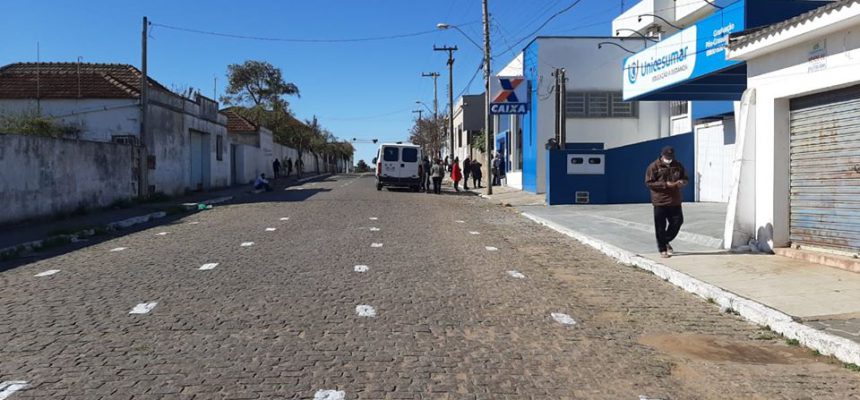 A Caixa Econômica Federal recebeu um reforço para o atendimento aos beneficiários do Auxílio Emergencial do Governo Federal. A partir desta quinta-feira (07), a quadra que fica em frente a instituição bancária será bloqueada para a passagem de carros, durante o horário de atendimento da agência. Demarcações ao longo da rua foram feitas por uma equipe da Secretaria Municipal de Obras para que os usuários fiquem a distância necessária um do outro, de acordo com as normas sanitárias que visam o combate ao coronavírus.
