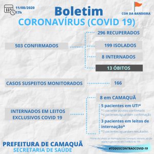 Nesta atualização, a Secretaria divulgou também um novo óbito associado à covid-19, de um homem de 80 anos, somando 13 mortes pela doença atualmente no município. Conforme a pasta, o paciente apresentava histórico de doença pulmonar obstrutiva crônica e cardiopatia. Além de todas essas comorbidades, ele estava acamado, desnutrido e desidratado. Estava internado no Hospital Nossa Senhora Aparecida (HNS) no dia 4 de agosto, por apresentar mal estado geral e esforço ventilatório. A coleta para o exame RT-PCR ocorreu neste mesmo dia, havendo liberação do resultado confirmatório para a covid-19 dois dias depois. O paciente veio a óbito no domingo (9).
