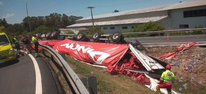 Caminhão tomba no trevo da Fenadoce em Pelotas