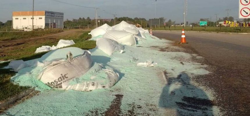 Carga de fertilizante tomba de carreta próximo ao trevo da BR-116 em Camaquã