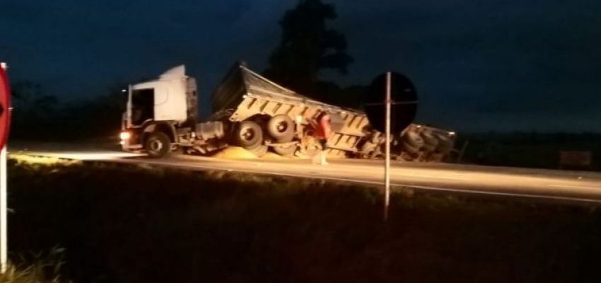 Durante o início da noite desta terça-feira (13), uma carreta carregada com soja tombou na BR-116, no km 377 em Tapes. De acordo com informações da Polícia Rodoviária Federal (PRF), não houve feridos. “As Informações são do Portal Clic Camaquã”