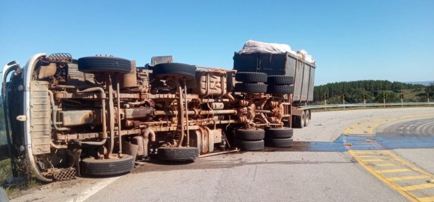 Uma carreta carregada com casca de madeira tombou na alça do viaduto da ERS 471, em Canguçu na manhã de sexta-feira, 08.