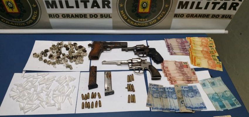 Um casal foi preso pela Brigada Militar com armas, munições, drogas e dinheiro em Tapes. A ação ocorreu na madrugada desta quinta-feira (9), na Rua Havana, bairro Wolf.