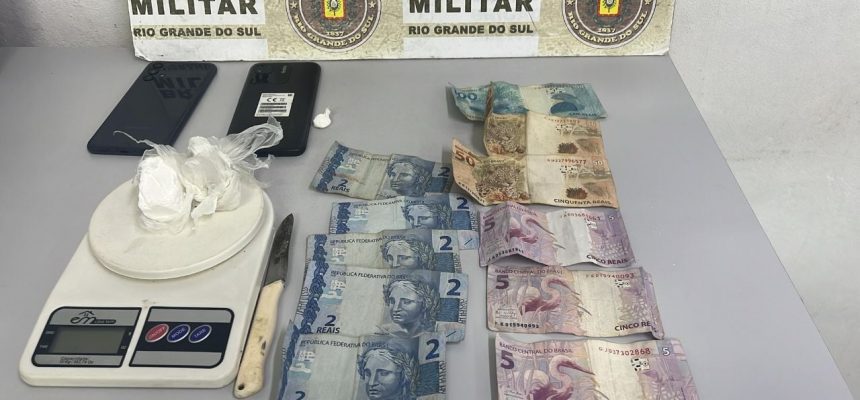 Durante patrulhamento, os suspeitos, um homem de 21 anos e uma mulher de 25, foram abordados e, com eles, os policiais encontraram 50 gramas de cocaína, uma balança de precisão, R$ 225 em notas variadas e um celular furtado dias antes.