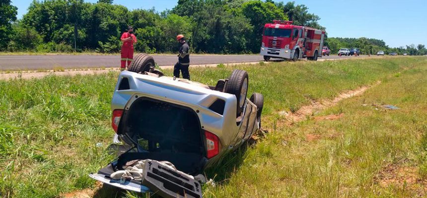O condutor do Honda Fit, cor prata, perdeu o controle do veículo que saiu da pista no trecho duplicado e capotou no canteiro central. O motivo do acidente não foi informado.