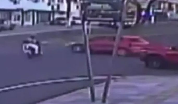 O choque foi registrado por uma câmera de segurança da região. Na imagem é possível ver dois carros agurdando na rua Duque de Caxias para cruzar a avenida João Goular. Um dos veículos, um Volkswagen Gol de cor vermelha, avança lentamente por trás do outro, até obstruir completamente a passagem da motocicleta que se aproximava no sentido preferencial.