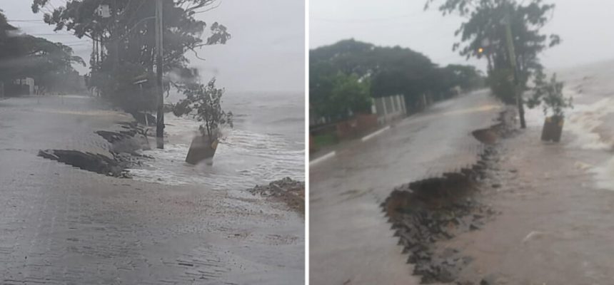 Na cidade de Arambaré, as águas avançaram na Orla da Praia do Caramuru, destruindo a área de circulação da comunidade.