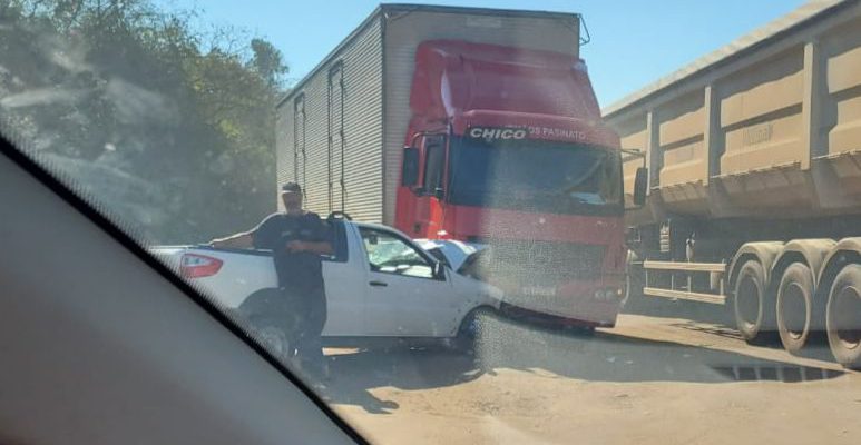 A colisão envolveu uma Picape leve e um caminhão. O acidente ocorreu no km 361 na BR-116, em Tapes. A pista está liberada com fluxo lento no local.