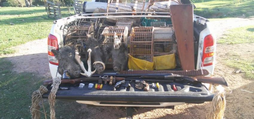 Duas armas de caça, duas garruchas, ambas de calibre 22, várias munições, 19 pássaros silvestres, um pássaro exótico e quatros crânios de javali foram apreendidos na propriedade rural. O proprietário e suspeito do crime não estava em casa no momento da apreensão.