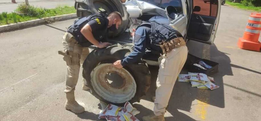 Ao verificar a caminhonete, foram localizadas embalagens de agrotóxicos escondidas na mala de roupas do motorista e, no compartimento de cargas, dentro de dois pneus de trator, totalizando 158 kg.