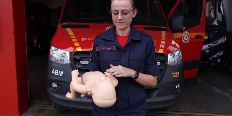 A soldado Koch, que integra o CBMRS e também é graduada em enfermagem, explicou o passo a passo para o desengasgo de bebês. O processo envolve manobras específicas e exige alguns cuidados. Embora trate-se de uma situação delicada, a primeira dica é manter a calma.