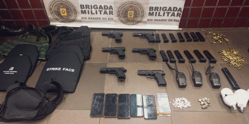 Segundo a BM, os criminosos, atiraram contra os policiais, que revidaram. Com os bandidos, foram apreendidas seis pistolas e munições, além de coletes balísticos, rádios comunicadores, 50 pedras de crack, dez porções de maconha, câmeras de vídeo, cinco telefones celulares e dinheiro.