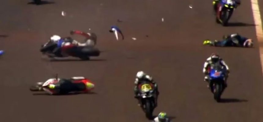 Nas imagens é possível ver que um dos piloto cai após uma curva, tenta levantar, mas é atingido pelo outro competidor. Os dois ficaram gravemente feridos.