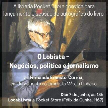 O jornalista e sócio do Grupo RBS Fernando Ernesto Corrêa lança em sessão de autógrafos na próxima terça-feira (7), às 18h, na livraria Pocket Store (Rua Félix da Cunha, 1167 – Moinhos de Vento, Porto Alegre), “O Lobista – Negócios, política e jornalismo”, em depoimento ao jornalista Márcio Pinheiro.