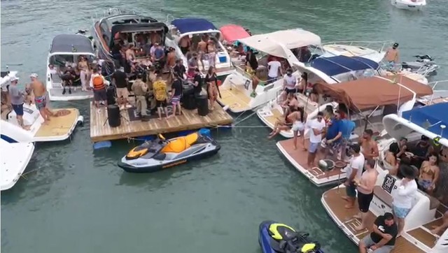 Uma festa clandestina com 23 embarcações no mar e show ao vivo em um deque flutuante foi interrompida em Governador Celso Ramos, na Grande Florianópolis (SC), no sábado (17). Os participantes do evento infringiram diversas regras do decreto vigente no Estado que busca frear a pandemia de coronavírus.