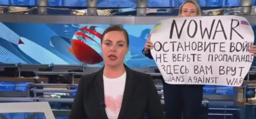 A manifestante foi reconhecida como Marina Ovsyannikova. Ela apareceu durante a transmissão com um cartaz que dizia: “Não acredite na propaganda. Eles estão mentindo pra vocês aqui”. Enquanto mostrava o cartaz, Marina gritava “Parem com a guerra. Não à guerra”.