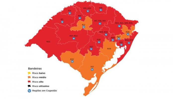 Divulgada na sexta-feira (25), a classificação preliminar desta rodada indicou 15 das 21 regiões Covid com alto índice de contágio e de ocupação dos hospitais por coronavírus, o que representa 76,5% da população gaúcha no nível vermelho. Apenas Guaíba, Taquara, Novo Hamburgo, Cruz Alta, Pelotas, Bagé e Guaíba apresentaram risco epidemiológico médio e, portanto, receberam bandeira laranja.