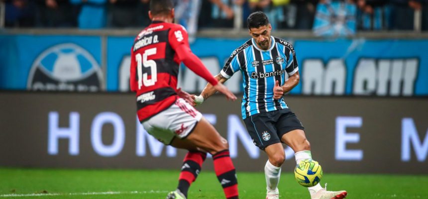 Os minutos iniciais foram movimentados, como se esperava do jogo. O Grêmio logo de cara levou perigo aos 3 minutos, quando Luis Suárez percebeu Matheus Cunha adiantado e tentou mandar por cobertura do meio-campo – a bola viajou até quase chegar à meta, mas por detalhe ela acabou saindo à direita do ângulo. De imediato, o Flamengo teve uma sequência no campo de ataque, com escanteios, mas nada que passasse pela defesa tricolor e por Gabriel Grando.