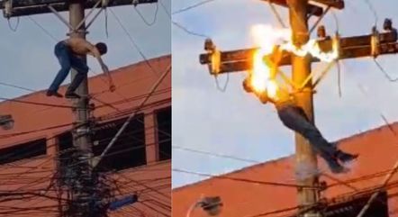 Em imagens enviadas à reportagem da Record TV, é possível ver o momento em que o homem, que estava sem camisa, já está em cima do poste e tenta se equilibrar.