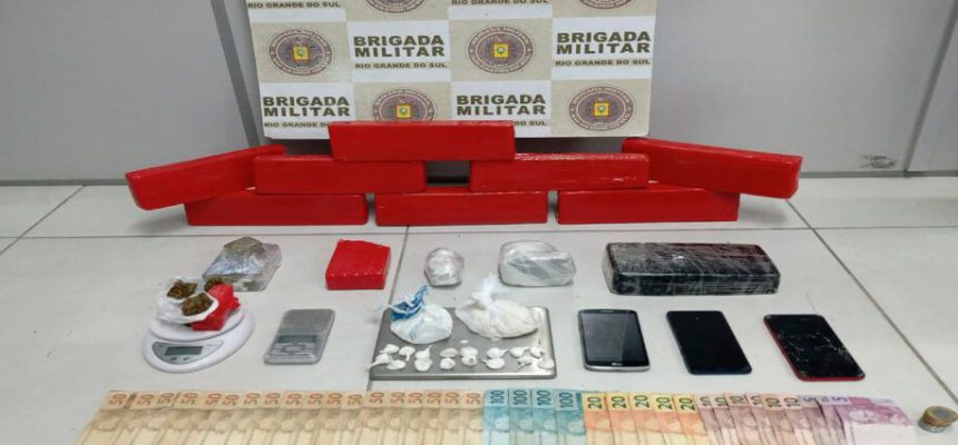 Em São Lourenço do Sul, na noite da última sexta-feira (28), a Brigada Militar efetuou a prisão de um homem por tráfico de drogas, na rua Santa Cruz, em São Lourenço do Sul. Os policiais militares realizaram a abordagem ao homem, de 26 anos, em via pública, e em sua posse localizaram 5,357 kg de maconha, 168 g de cocaína, 1 kg de crack, 2 balanças de precisão, 3 celulares e  a quantia de R$1.480,50.