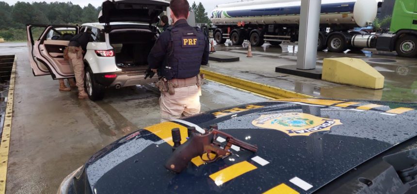 Durante o patrulhamento da rodovia, os PRFs abordaram uma Range Rover Evoque que transitava em excesso de velocidade. Após consultas ao histórico do condutor, a equipe realizou buscas no veículo e localizou, em compartimento oculto no porta luvas, um revolver cal.38, com numeração raspada.