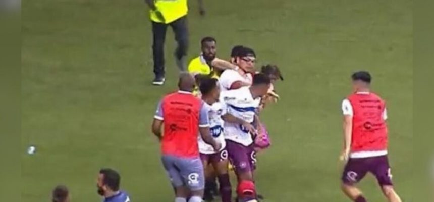 Foi então que uma confusão tomou conta do local, com direito a invasão de campo por parte dos torcedores e troca de socos.