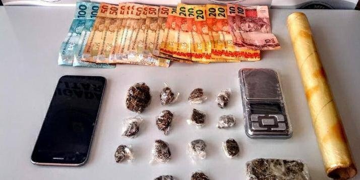 Em revista pessoal, foram encontrados com ele um tablete de maconha, pesando 74,5 gramas, e um aparelho celular. Ainda durante a abordagem, foram localizadas 14 porções de maconha, pesando 25,3 gramas, além de uma balança digital, um rolo de plástico filme e a quantia de R$ 790.