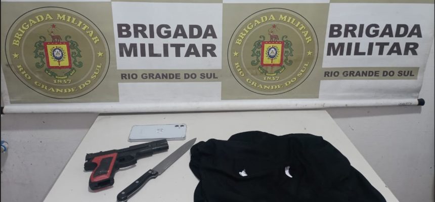 O indivíduo foi preso e encontrado em sua posse uma faca e um simulacro de arma. A guarnição encaminhou o criminoso para a Unidade de Pronto Atendimento (UPA) e após, à Delegacia de Polícia de Pronto Atendimento (DPPA).