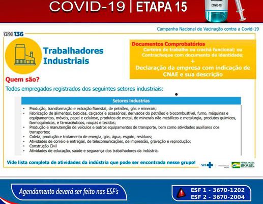 Pode ser uma imagem de ‎texto que diz "‎136 VACINAÇÃO COVID-19 ETAPA 15 VACCINE COVID-19 Campanha Nacional مماار Vacinação contra Trabalhadores Industriais Covid-19 Documentos Comprobatórios Carteira trabalho crachá funcional; com documento identidade; Quem são? Todos empregados registrados dos seguintes setores industriais: Declaração empresa com indicação de CNAE sua descrição transformação extração manutenção Industrias minerais; erivados petróleo biocombustível, fumo, máquinas metal, minerais metalurgia produtos químicos, equipamentos correio Construção transporte, bem energia, elecomunicaçõe atividades auxiliares saúde segurança dos trabalhadores Vide lista completa de atividades da indústria impressão gravação reprodução; pode encontrada nesse grupo! Agendamento devará ser feito BRASIL ESF's ESF 3670-1202 3670-2004 SECRETARIA MUNICIPAL DA SAÚDE MUNICÍPIODE AMARAL FERRADOR‎"‎