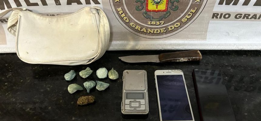 Conforme o 30° BPM, a prisão ocorreu após receber as denúncias anônimas de tráfico de drogas na região. Com a mulher foi encontrado: uma faca, uma bolsa, oito porções de drogas, uma balança e dois celulares.