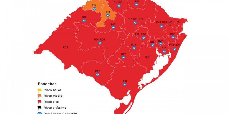O Rio Grande do Sul ficou quase todo na cor vermelha no mapa preliminar da 36ª rodada do modelo de Distanciamento Controlado. Dezenove das 21 regiões Covid estão com alto risco epidemiológico, o que representa 95,8% da população gaúcha sob alto risco de contaminação e, principalmente, esgotamento de leitos. Apenas duas regiões – Ijuí e Santa Rosa – ficaram na bandeira laranja.