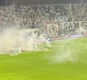 Torcida do Santos joga objetos, e jogadores correm para o vestiário p