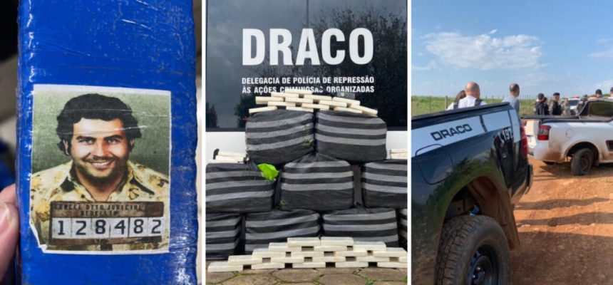 No local, agentes localizaram 218 kg de maconha. Os tijolos traziam impressos a foto do traficante Pablo Escobar, como uma espécie de “selo de qualidade”.