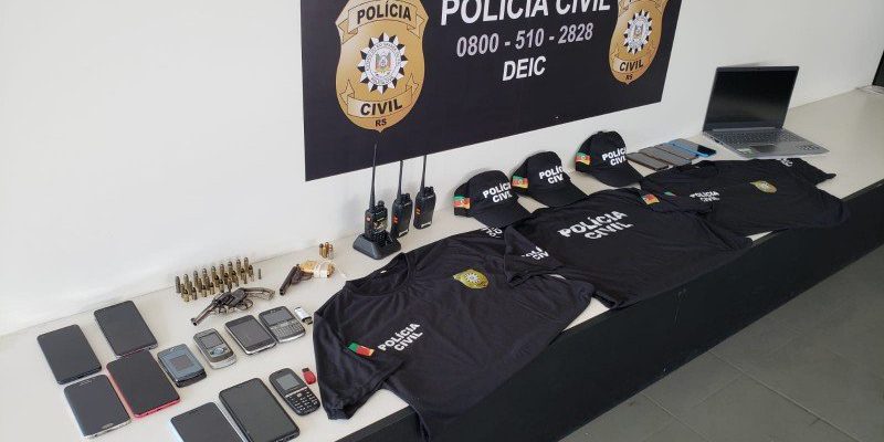 Na madrugada desta sexta-feira (4), a Polícia Civil e a Brigada Militar atuaram em conjunto na promoção de ações ostensivas para a repressão e prevenção das ocorrências de roubos a estabelecimentos comerciais no Estado. Foram cumpridas duas prisões temporárias e cinco ordens de busca e apreensão nas cidades de Canoas, Novo Hamburgo e Alvorada. Restaram apreendidos diversos documentos, dispositivos celulares, veículos, armas de fogo e munições e vestimentas com os emblemas e inscrições da Polícia Civil que eram utilizadas nas ações criminosas. Foram localizados, ainda, uniformes de uma empresa de vigilância.