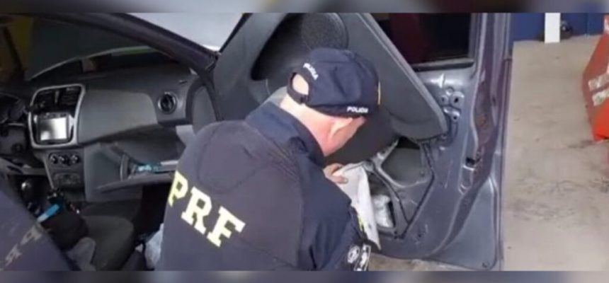 A equipe PRF foi então ao encontro do veículo e efetuou a abordagem. Os homens que estavam no carro ficaram muito apreensivos, instante em que os agentes decidiram vistoriar o Logan, encontrando a droga oculta nas portas dianteiras e no compartimento do motor.