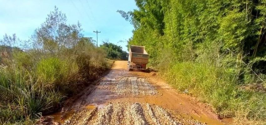 O governo municipal deslocou um servidor da secretaria de Obras e Infraestrutura em uma caçamba para cumprir a tarefa. Para falicitar o tráfego no local, o trabalhador espalhou pedra brita em um ponto da estrada que estava com acúmulo de barro e umidade.